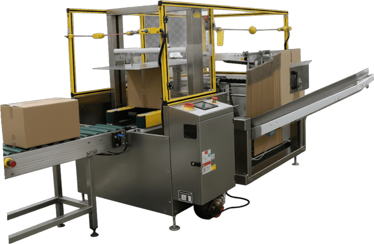 Once formed, the erected carton is transferred to the downstream conveyor where it continues through the packaging line for product loading and final sealing. The system ensures accurate and consistent case formation, allowing case packing equipment to operate without interruptions.