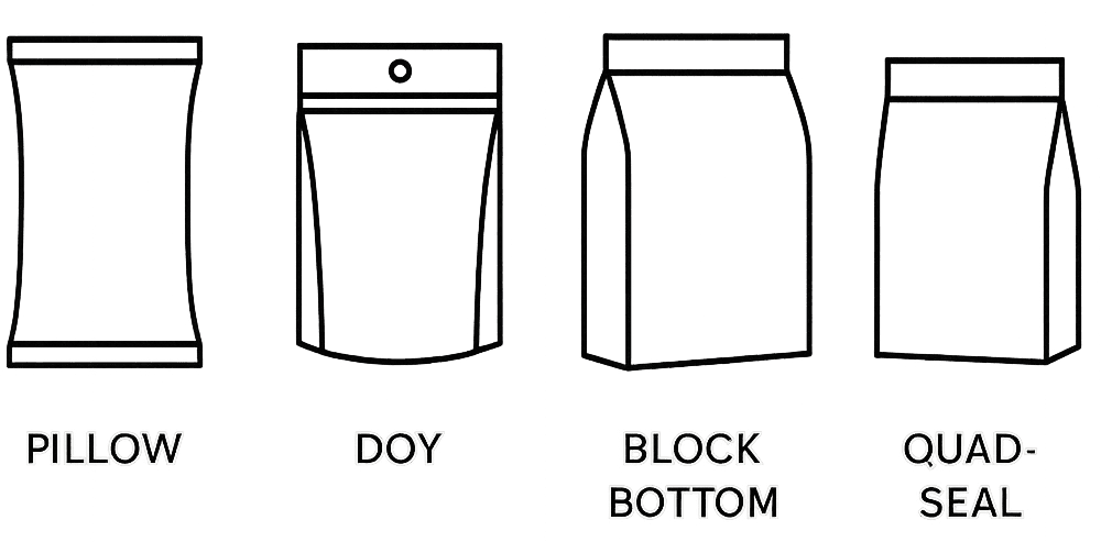 | Bag Type | Pillow , Quadseal flat bottoms, Doy | Gusseted, Quadseal (4 side opening) |