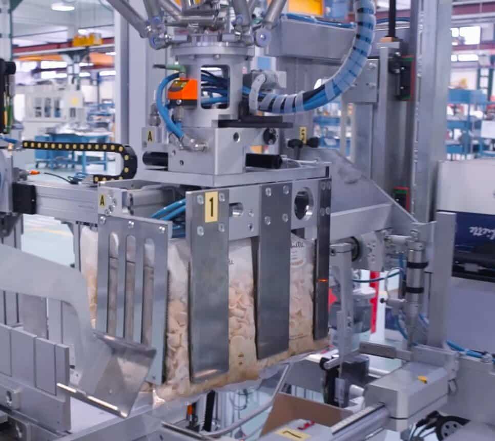 In this application, filled bags exit the bagging machine and are conveyed to a collation zone where they are grouped into a defined rows-and-columns pattern. The integrated top-load case packer erects RSC cartons automatically and places the stand-up bags into the open cartons from above using controlled pick-and-place motion. Once loaded, cartons are closed and sealed within the same machine frame before being discharged to palletising.