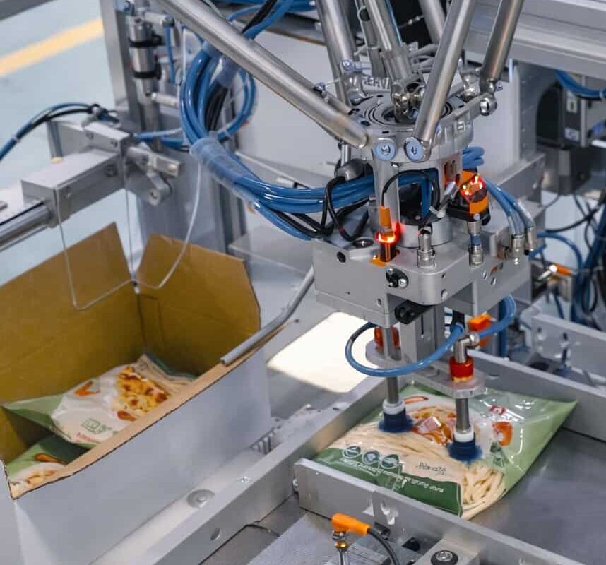 As part of an ADM turnkey system, case packers are synchronised with upstream VFFS machines, weighers, and conveyors, and designed to interface directly with robotic or conventional palletising systems. The result is a fully coordinated line where bagging, case packing, and palletising operate as one engineered solution, supported by a single accountable partner.