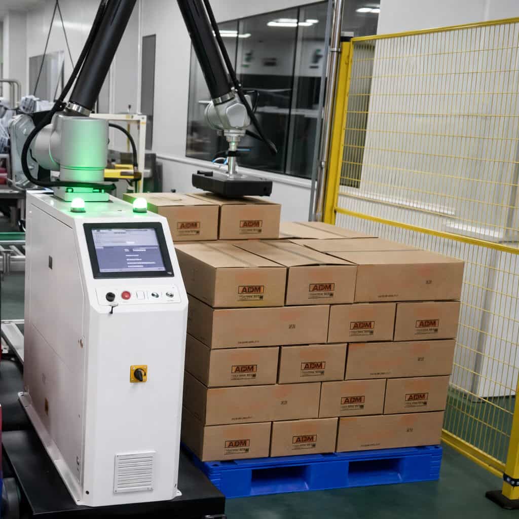 The palletiser integrates easily with upstream packaging equipment including case packers, bagging machines, conveyors, and pallet wrapping systems. With flexible programming and reliable industrial robotics, ADM entry-level palletising solutions provide manufacturers with a scalable automation platform as production demands grow.